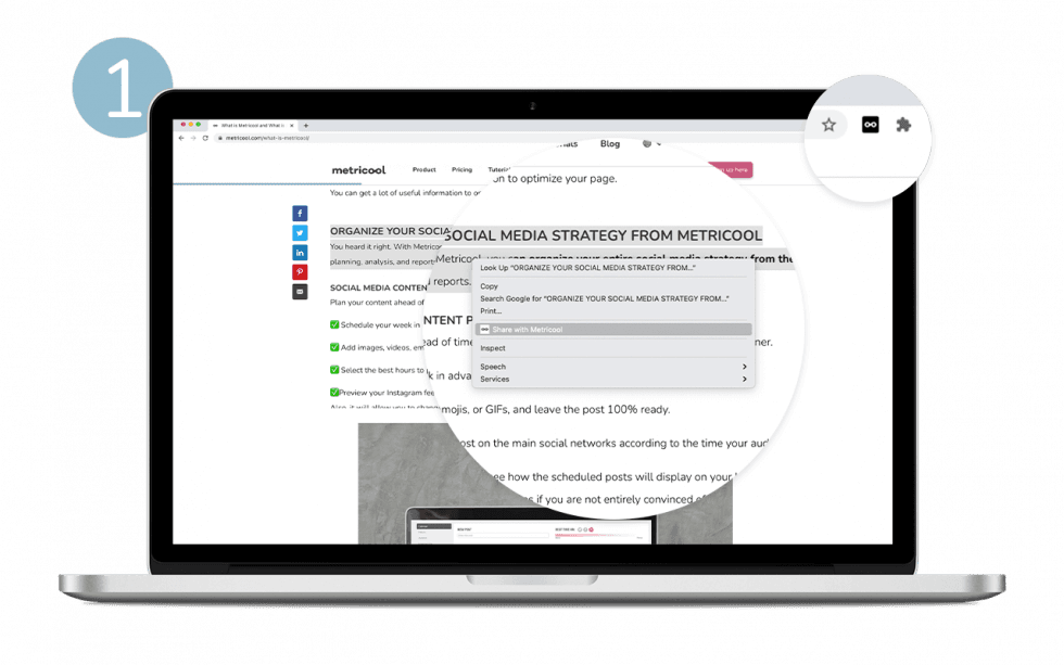 - Besuche die Webseite, die du teilen möchtest, und klicke auf das Metricool-Symbol in der oberen rechten Ecke.